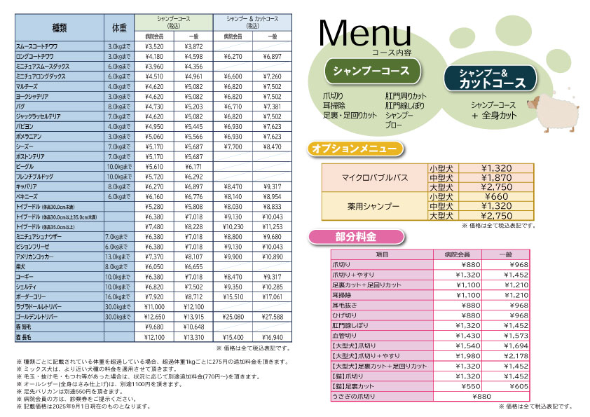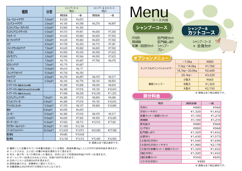 【Animi(仙台動物医療センター内)・鶴ヶ谷 料金表】